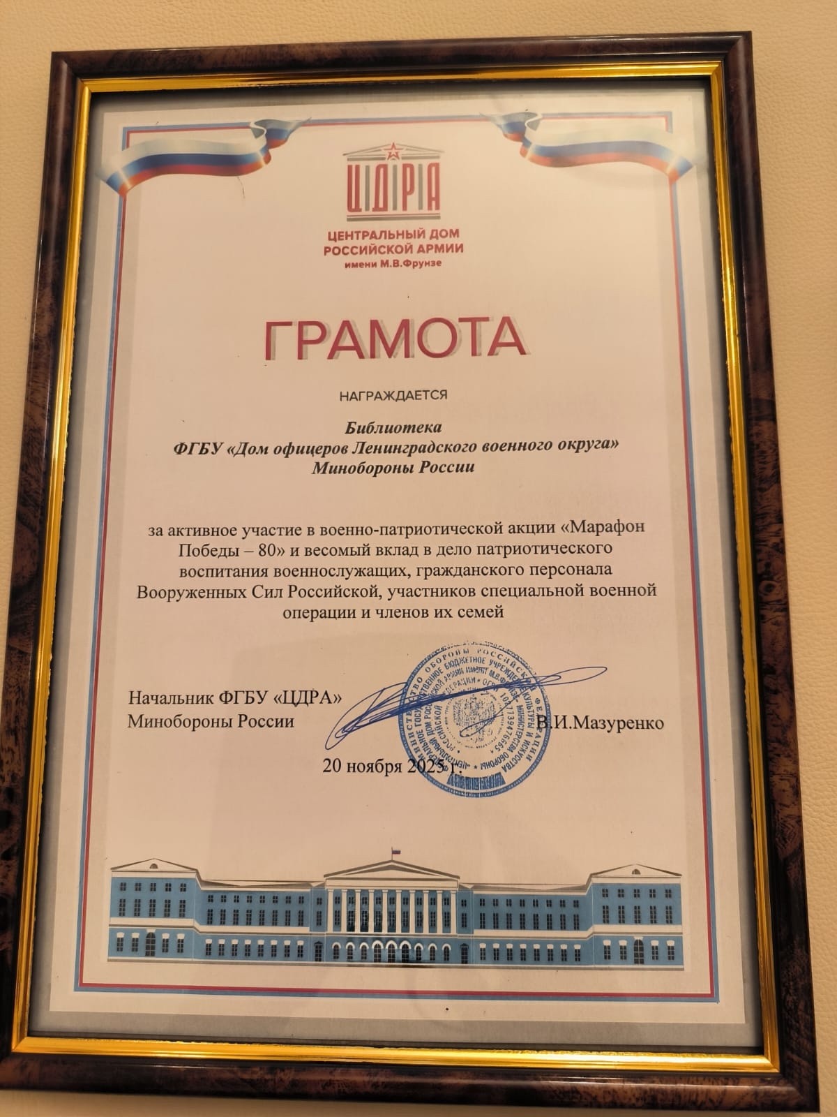 📚Особого внимания была удостоена работа Библиотеки Дома офицеров ЛенВО и вручена грамота за активное участие в военно-патриотической акции «Марафон Победы — 80» и весомый вклад в дело патриотического воспитания военнослужащих, гражданского персонала, участников СВО и членов их семей.