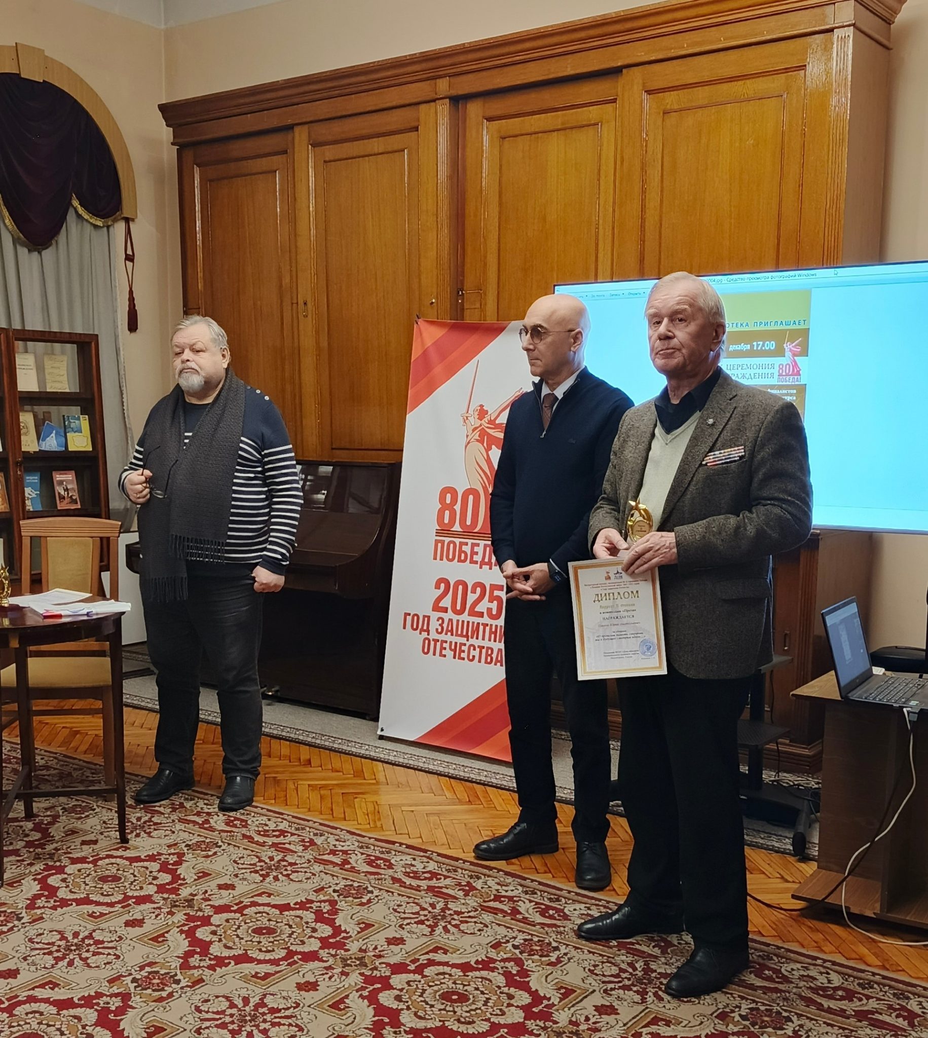 📆16 декабря 2025 года в Читальном зале библиотеки Дома офицеров Ленинградского военного округа прошла торжественная церемония награждения победителей и финалистов Литературного конкурса, посвященного 80-летию Победы в Великой Отечественной войне и году защитника Отечества. Почетные грамоты и награды победителям вручал начальник Дома офицеров Ленинградского военного округа — Сергей Альбертович Кононов.