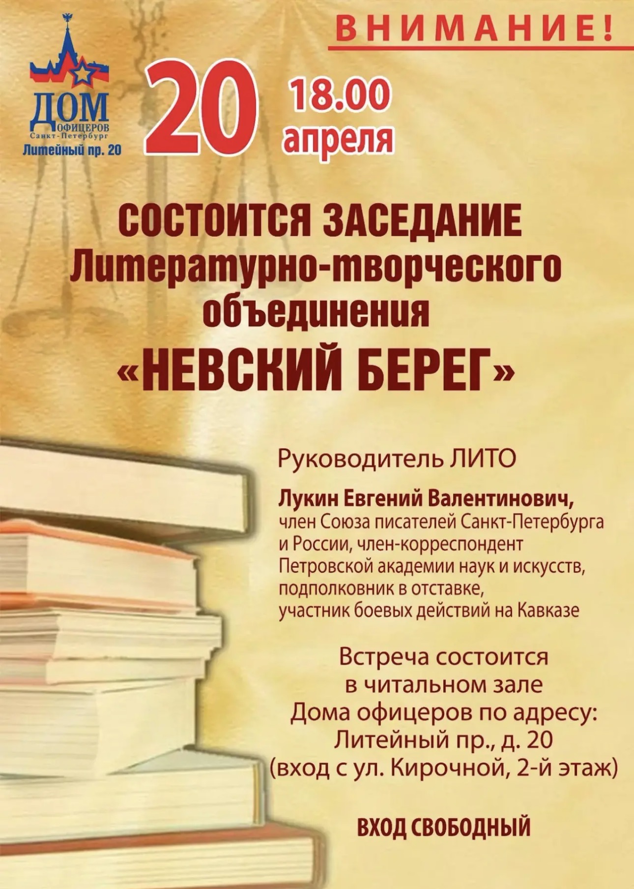« Все Мероприятия Заседание литературно-творческого объединения «Невский берег» Апрель 20 @ 18:00 - 19:00 « В честь 12-ой годовщины возвращения Крыма в состав России «Путь добровольца» Творческая встреча и настоящие истории с фронта «Плечом к плечу» » + Календарь Google+ Экспорт в iCal Подробности Дата: Апрель 20 Время: 18:00 - 19:00