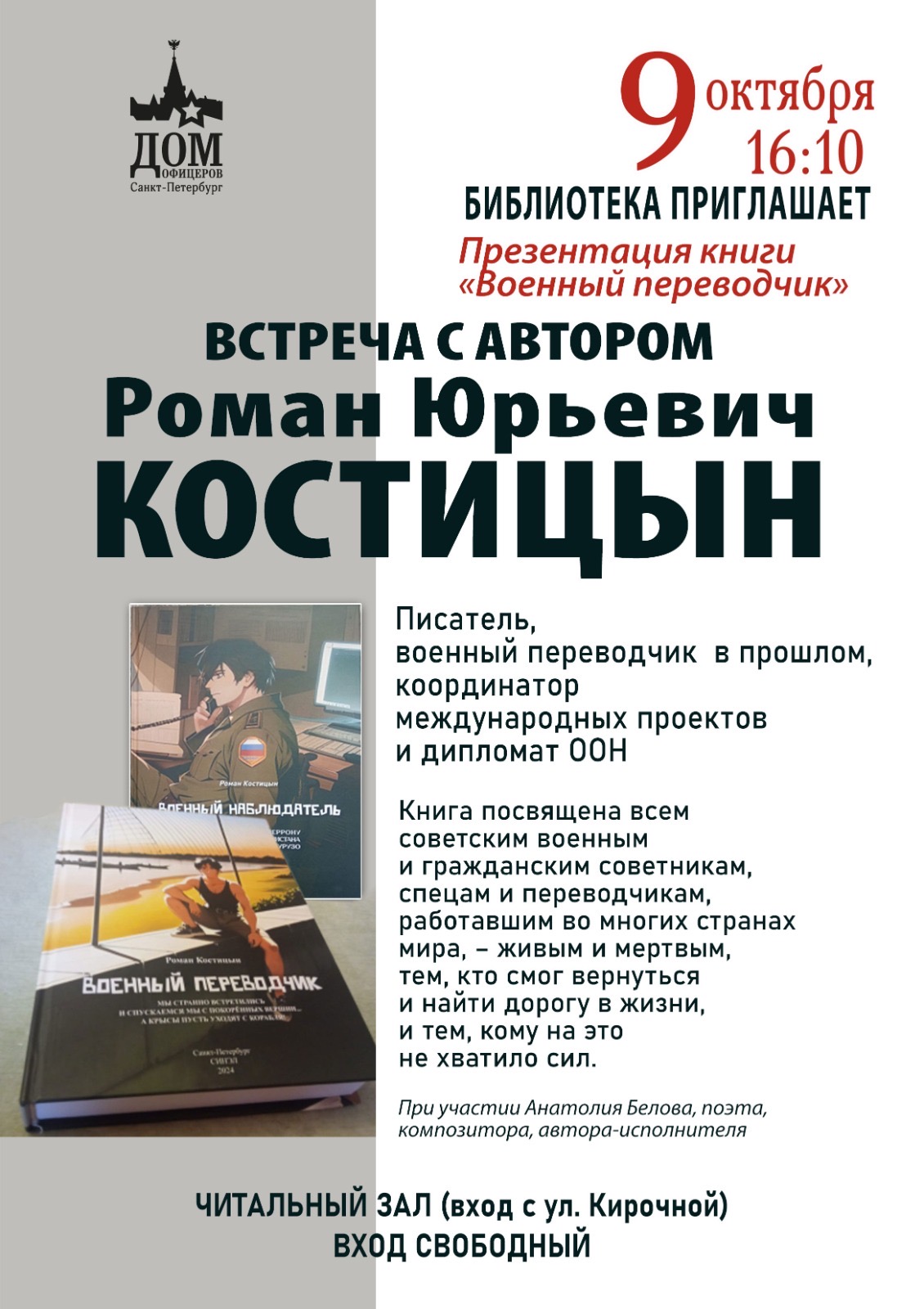 « Все Мероприятия Это мероприятие прошло. Презентация книги «Военный переводчик» Октябрь 9 @ 16:10 - 17:30 « Заседание литературно-творческого объединения «Невский берег» Концерт «О чем поют мужчины» » + Календарь Google+ Экспорт в iCal Подробности Дата: Октябрь 9 Время: 16:10 - 17:30